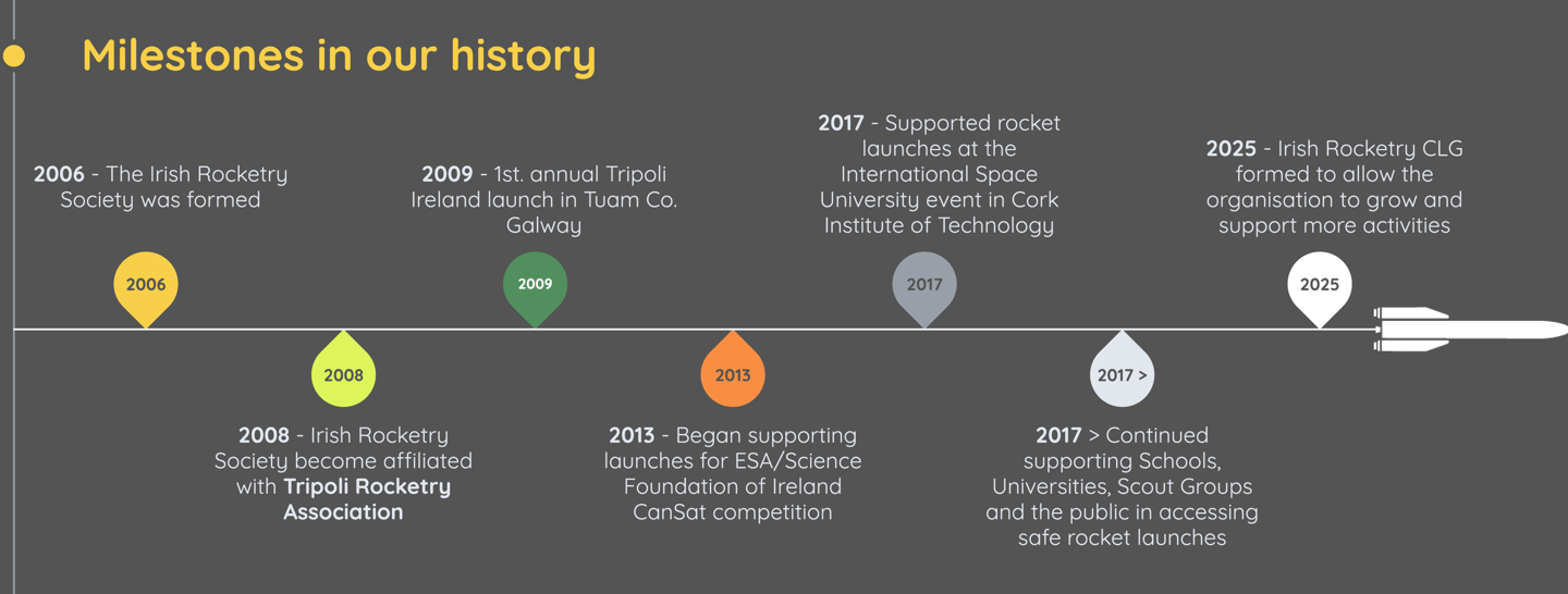 The Irish Rocketry Society, now called Irish Rocketry, was founded in 2006 by a small group of rocketry enthusiasts, Ash McFadden, Colin Fitzsimons and later Eric Stenzel. Their goal was to make model and high-power rocketry an accessible hobby in Ireland.